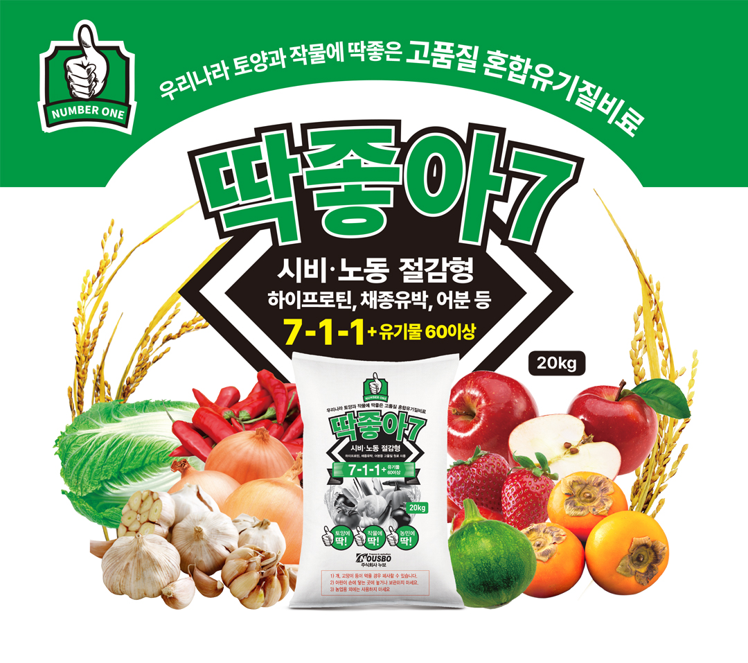 하이프로틴, 채종유박, 어분 등 고품질 원료 사용 7 - 1 - 1 + 유기물 60이상
