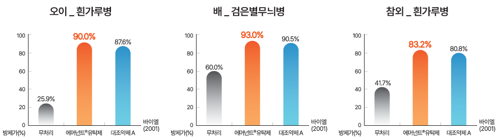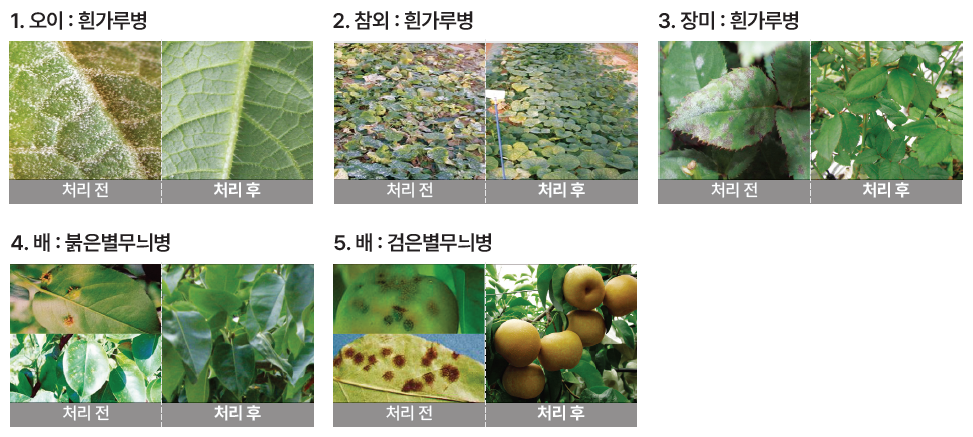 고추, 수박, 오이, 참외 등의 흰가루병과 수박 덩굴마름병 뿐만 아니라, 배 검은별무늬병ㆍ붉은별무늬병, 단감 둥근무늬낙엽병에도 높은 방제효과를 나타냅니다.