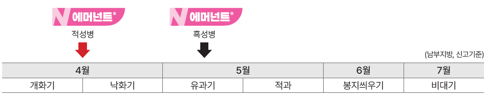 2. 배 붉은별무늬병(적성병) : 4월 중순(잎이 전개되기 시작할 때) 이후 비가 내린 뒤 살포