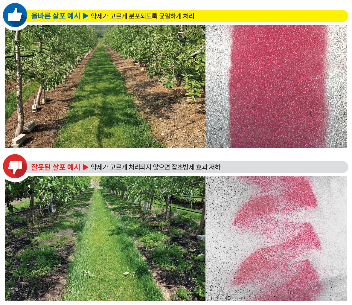 다년생 잡초가 적은 과원 : 1차는 4월, 2차는 6월 ~ 7월에 살포.