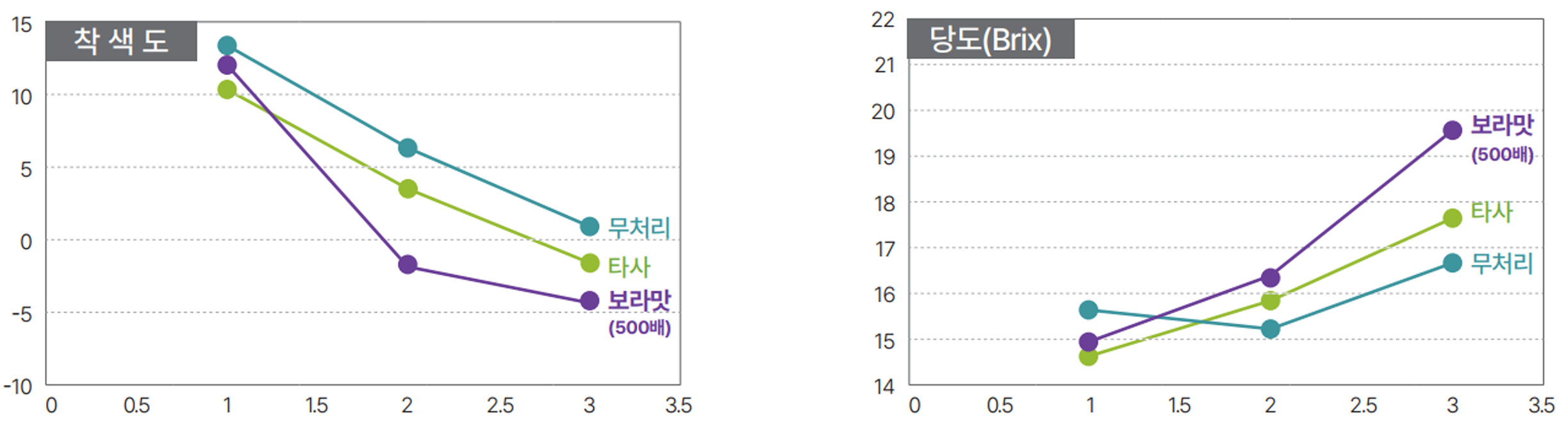 • 실험결과 : 당도 측정결과 보라맛(500배 희석) > 관행제품 > 무처리 순으로 높게 나타났음