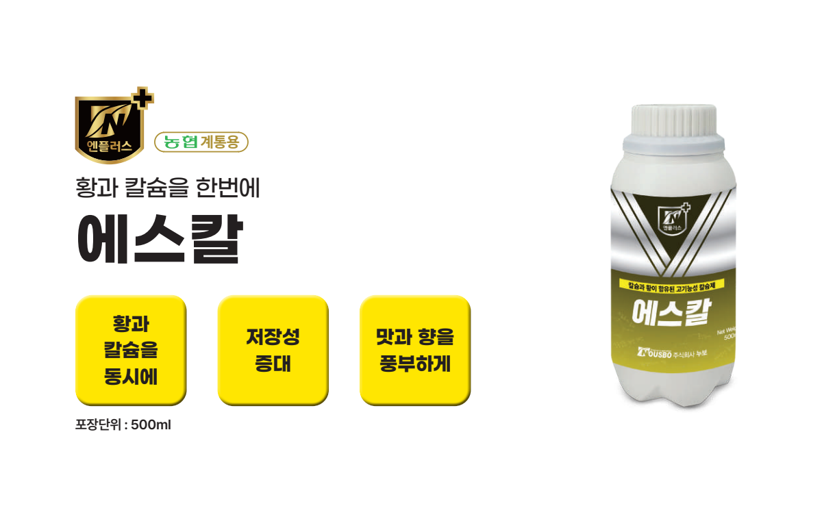 에스칼에 함유된 황 성분은 시스테인, 시스틴, 메티오닌 같은 아미노산 합성에 필요하며 작물의 맛과 향을 풍부하게 해주는 역할을 하며, 칼슘과 황은 100% 수용성으로 사용 후 빠르게 흡수되어 빠르게 효과를 나타냅니다.