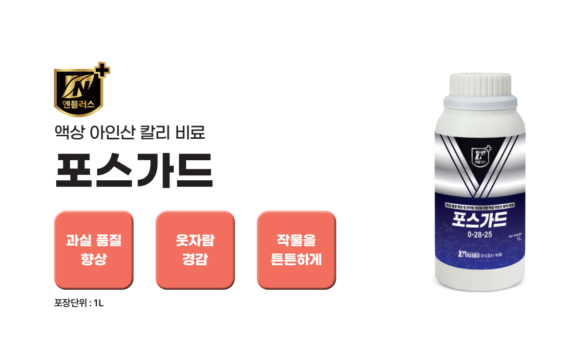포스가드는 식물체 내에 흡수되어 광합성 능력을 향상시키는데 도움을 주고, 엽색 증진 및 탄수화물 생성과 당 축적을 도와줍니다.