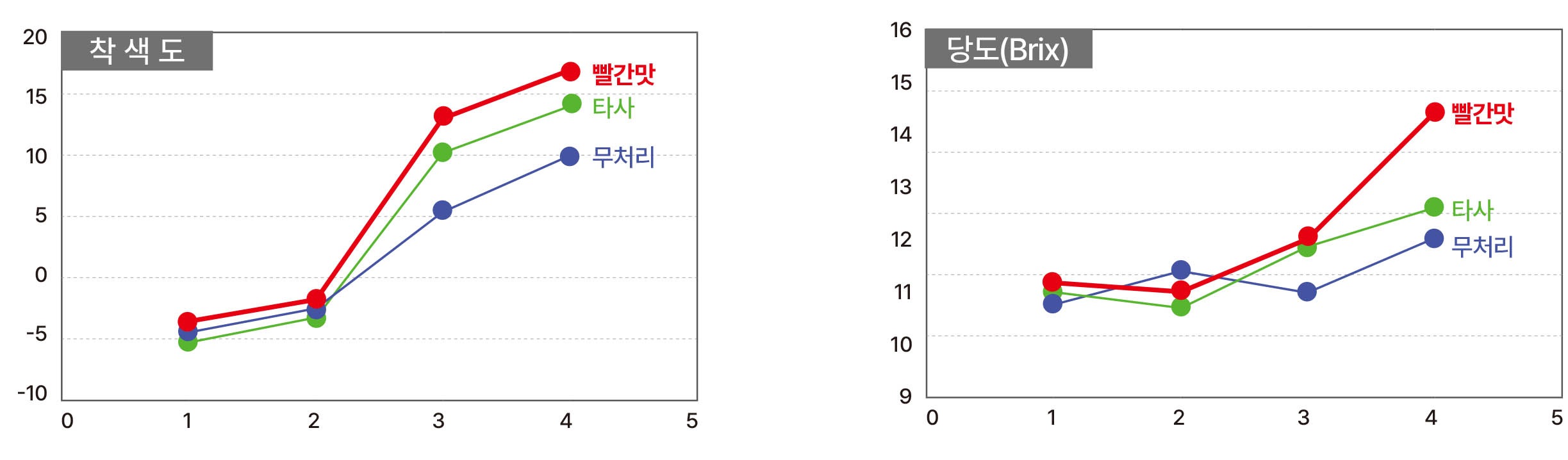 • 실험결과(거창) : 빨간맛 처리구의 착색도가 향상되었으며, 당도 증가