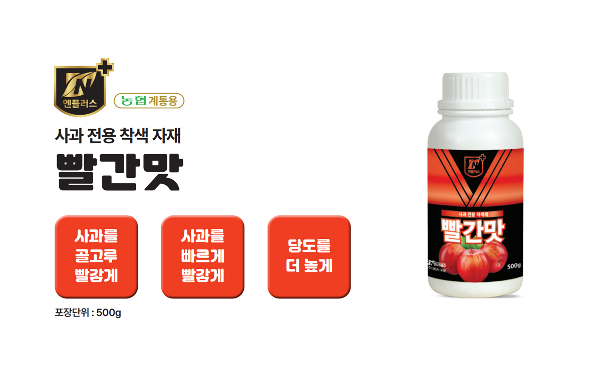 착색에 효과적인 특수 기능성 아미노산 2종과 고함량의 인산, 칼륨을 함유하고 있어 사과의 색이 더욱 빠르고 골고루 들 수 있도록 도움을 줍니다.