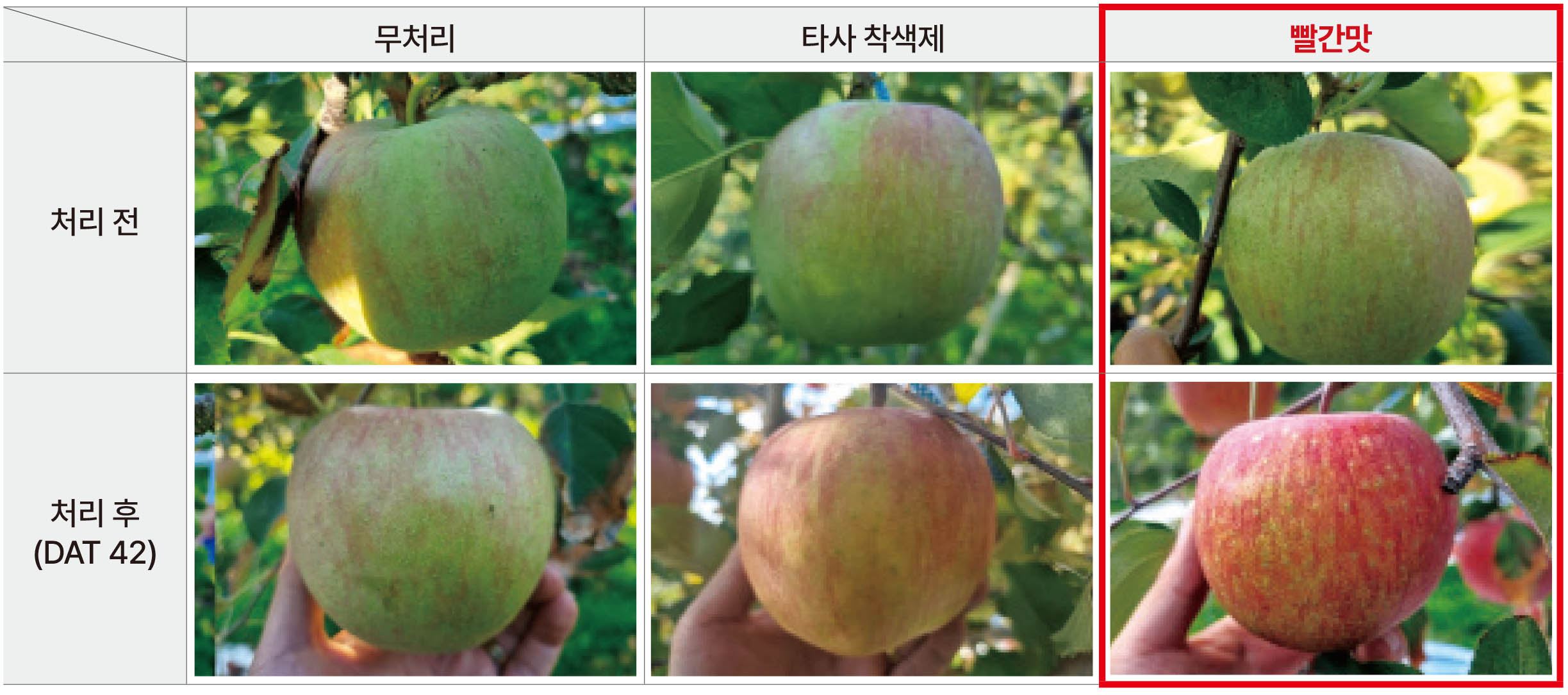 • 실험결과(청송) : 빨간맛 1차 처리 후 사과 착색이 진행되기 시작했으며 빠르게 착색이 되어서 2차 처리 후 바로 수확을 진행하였음. 주변 다른 농가는 아직 착색이 되지 않아서 수확을 진행하고 있지 못하고 있는데 빨간맛 처리 후 빠르게 착색이 되어서 주변 다른 농가 보다 1주일 빠르게 수확이 가능해서 비효에 대하여 매우 만족스럽다.