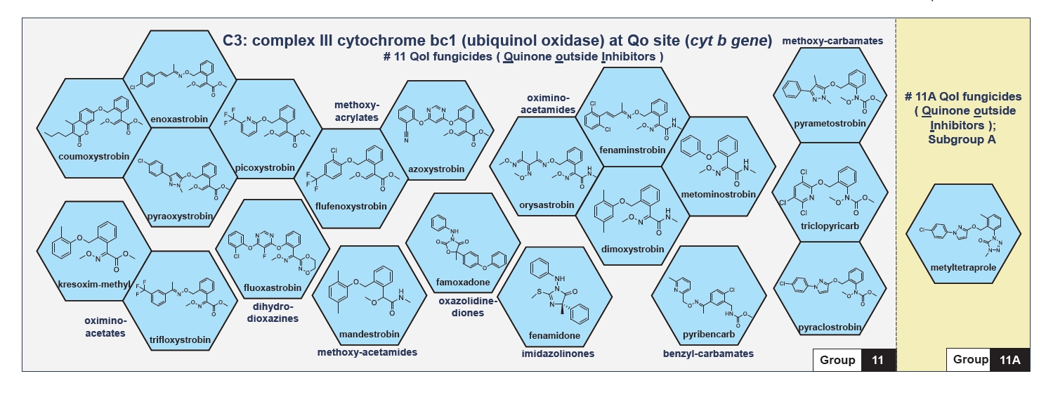 스트로빌루린계 (QoI)와 같은 그룹으로 분류되지만, 구조적 차별성 때문에 고유한 특성을 가지며 Frac Code 11A로 별도 분류되고, Frac Code 11 그룹과는 교차저항성이 없습니다.