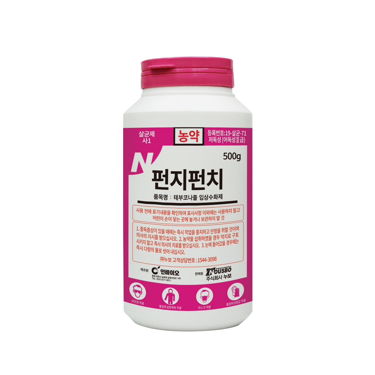 ・주성분함량 : Tebuconazole 25% ・계통 : 트리아졸계 ・작용기작 : 사1 ・Frac code : 3 ・제형 : 입상수화제(WG) ・인축독성·어독성 : 저독성·Ⅲ급 ・제조원 : 인바이오㈜ ・판매원 : 주식회사 누보 ・농약등록번호 : 19-살균-71 ・사용량 : 0.5g/㎡