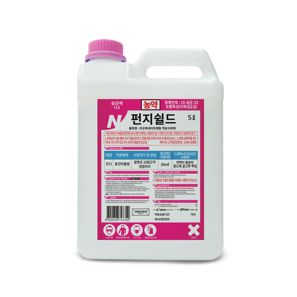 ・주성분함량 : Thiophanate-methyl 40% ・계통 : 카바메이트계 ・작용기작 : 나1 ・Frac code : 1 ・제형 : 액상수화제(SC) ・인축독성·어독성 : 보통독성·Ⅲ급 ・제조원 : 인바이오㈜ ・판매원 : 주식회사 누보 ・농약등록번호 : 19-살균-32 ・사용량 : 1ml/㎡