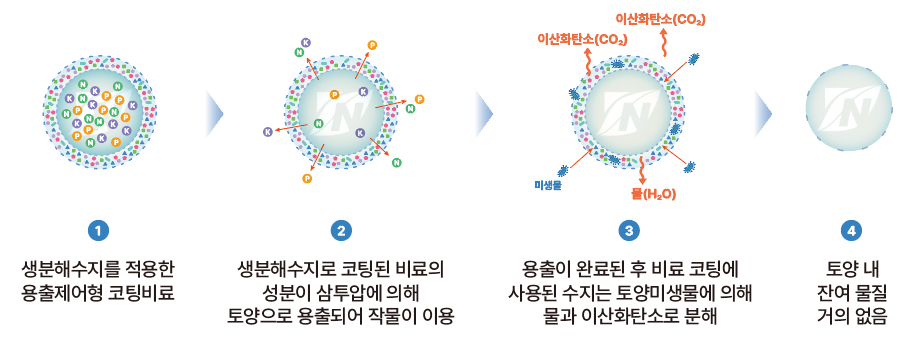 자연계에 존재하는 미생물에 의해 생분해 되는 수지로 코팅된 완효성 비료입니다.