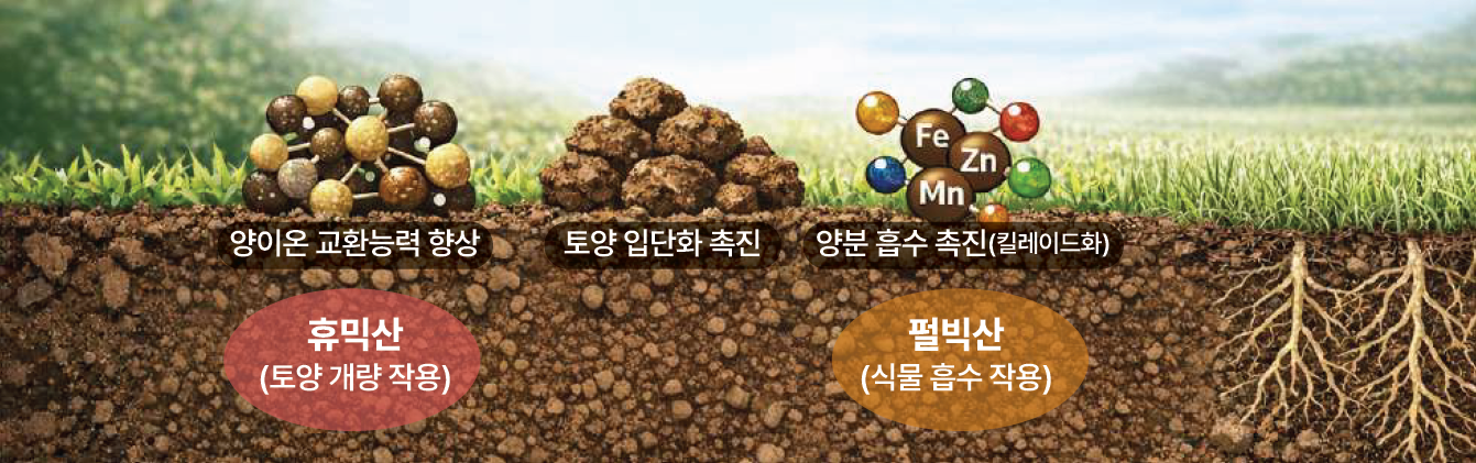 부식산(Humic Acid)은 토양 유기물이 미생물 작용을 통해 분해·축적되면서 형성된 천연 유기물의 집합체입니다. 부식산을 시비하면 토양의 이화학적 · 생물학적 환경을 개선함과 동시에, 양이온 교환능력 향상, 토양 입단화, 양분 흡수 촉진(킬레이트화), 뿌리생육 증진 등의 효과를 기대할 수 있습니다. 부식산은 용해성과 분자량 특성에 따라 휴믹산(토양 개량 작용)과 펄빅산(식물 흡수 작용)으로 구분하여 사용됩니다.
