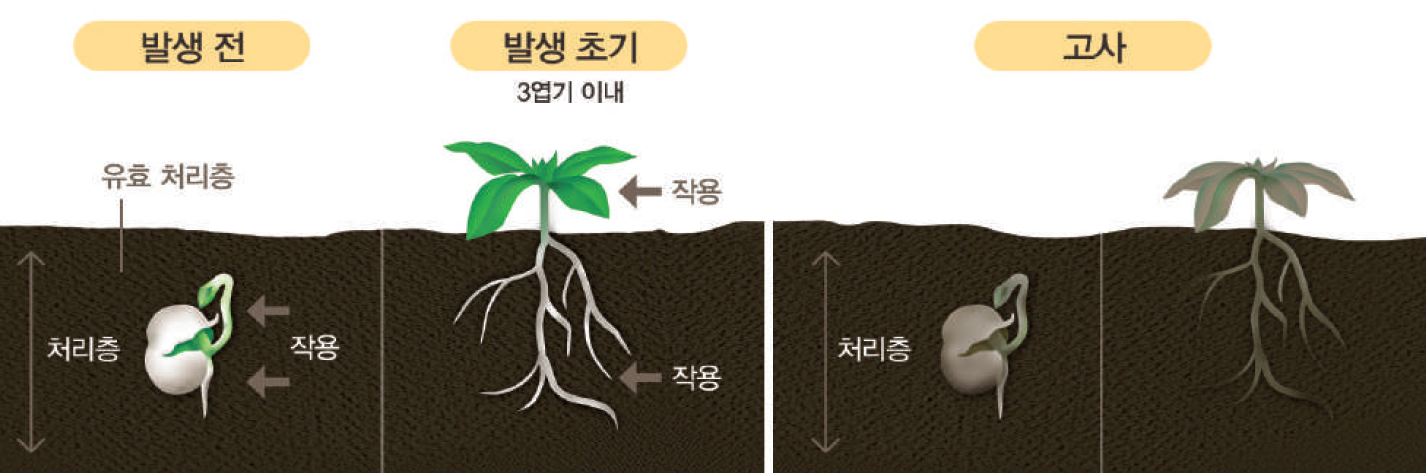 발아전 처리 효과 + 경엽 처리 효과로 잡초 고사 이후에도 발아 억제가 지속됩니다.