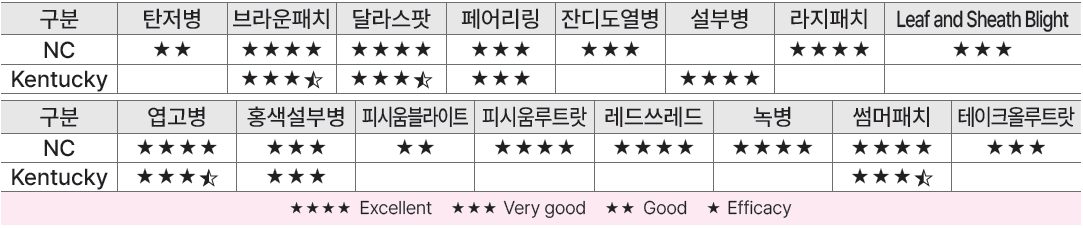 구분 | 탄저병 | 브라운패치 | 달라스팟 | 페어리링 | 잔디도열병 | 설부병 | 라지패치 | Leaf and Sheath Blight |