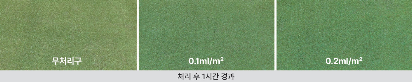 잎 표면에 강하게 응집하여 색상과 효과를 더 오래 유지시켜 주며, 처리 후 3일까지 진해지다가 잔디를 깎으면서 자연스러운 색상으로 변화합니다.