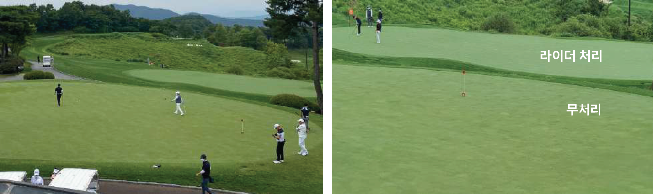 색상은 휴면상태인 잔디에서 더 오래 지속되며 지온 증가에 도움을 줍니다. (무처리구와 비교하면, 약 3℃ 정도 높습니다.)