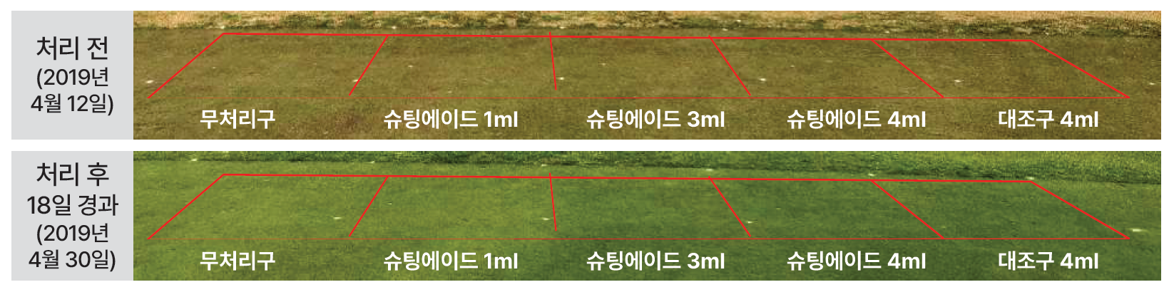 결과 : 처리 후 진해진 엽색이 2주 넘게 유지됨, 봄철 슈팅에이드 3ml 이상을 추천함