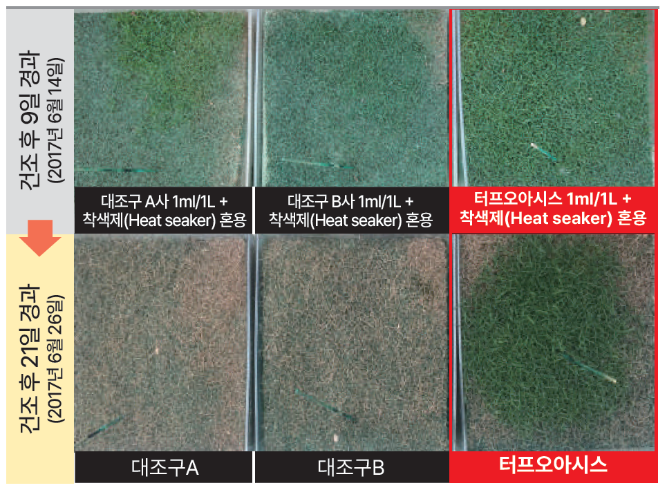 잔디가 건조, 한발(Drought)을 잘 견딜 수 있도록 최적의 상태를 유지(고온 스트레스 회피) 시켜줍니다.